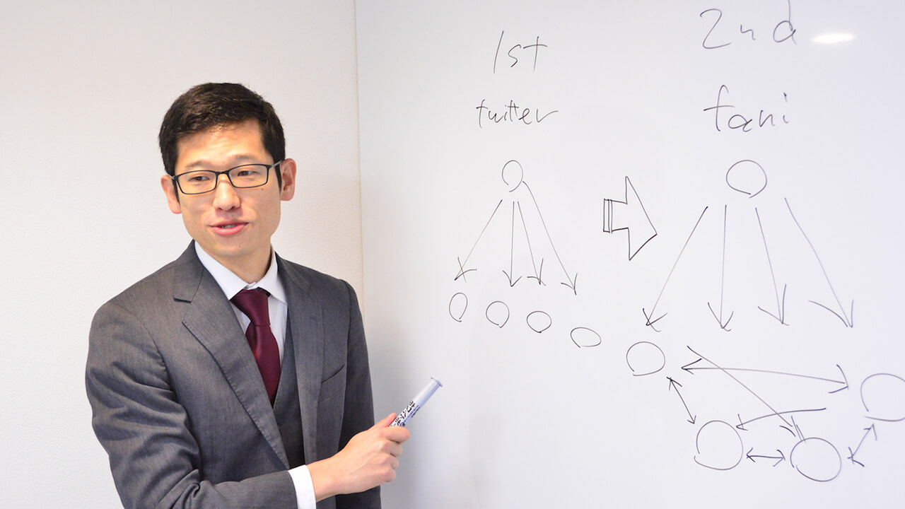 私達が実現したかったのは、公式から情報を発信するだけでなく、ファン同士も交流する形なんです。1期の時にはこのように、ツイッターでファンの皆さまに一方的に情報を発信するだけでした。【ホワイトボードに図を書きながら】